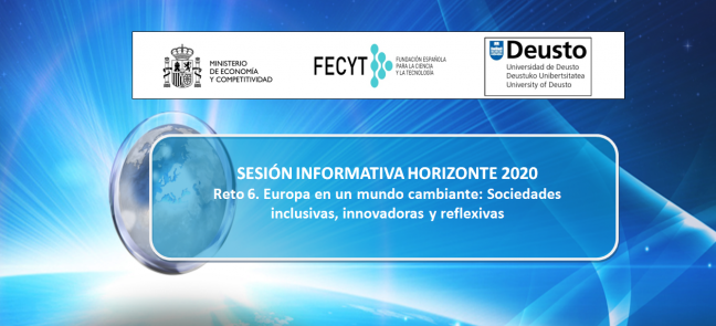 La Oficina de Proyectos Internacionales de Investigación de la Universidad de Deusto, junto con el Ministerio de Economía y Competitividad-MINECO y la Fundación Española para la Ciencia y Tecnología-FECYT, celebra el próximo viernes, 24 de enero, una jornada informativa sobre el lanzamiento en el País Vasco del Reto 6 Europa ante un mundo cambiante-sociedades inclusivas, innovadoras y reflexivas, del nuevo programa europeo de Investigación e Innovación Horizon 2020.
