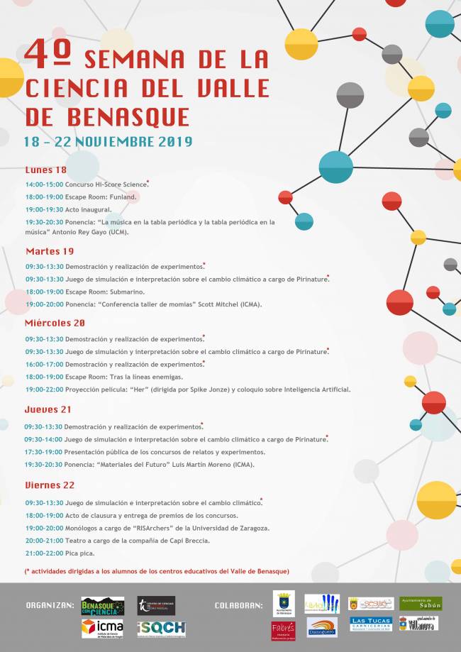 El Instituto de Ciencia de Materiales de Aragón (ICMA) y el Instituto de Síntesis Química y Catálisis Homogénea (ISQCH), mixtos entre el Consejo Superior de Investigaciones Científicas (CSIC) y la Universidad de Zaragoza (UNIZAR), la Asociación Benasque Conciencia y el Centro de Ciencias Pedro Pascual, organizan la IV Semana de la Ciencia del Valle de Benasque, que tendrá lugar del 18 al 22 de noviembre en el Centro de Ciencias de Benasque Pedro Pascual.