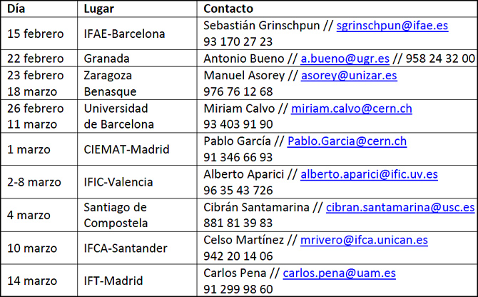 A la Universidad de Santiago de Compostela le toca el turno el 4 de marzo, seguida por el Instituto de Física de Cantabria (IFCA, CSIC-UC) el 10 de marzo. Cierra el programa el Instituto de Física Teórica (IFT, UAM/CSIC) el 14 de marzo. Todos los centros que organizan la masterclass internacional en física de partículas en España participan en la Red Consolider CPAN, que continúa la coordinación entre centros de investigación españoles iniciada con el proyecto Consolider-Ingenio 2010 Centro Nacional de Física de Partículas, Astropartículas y Nuclear (CPAN).