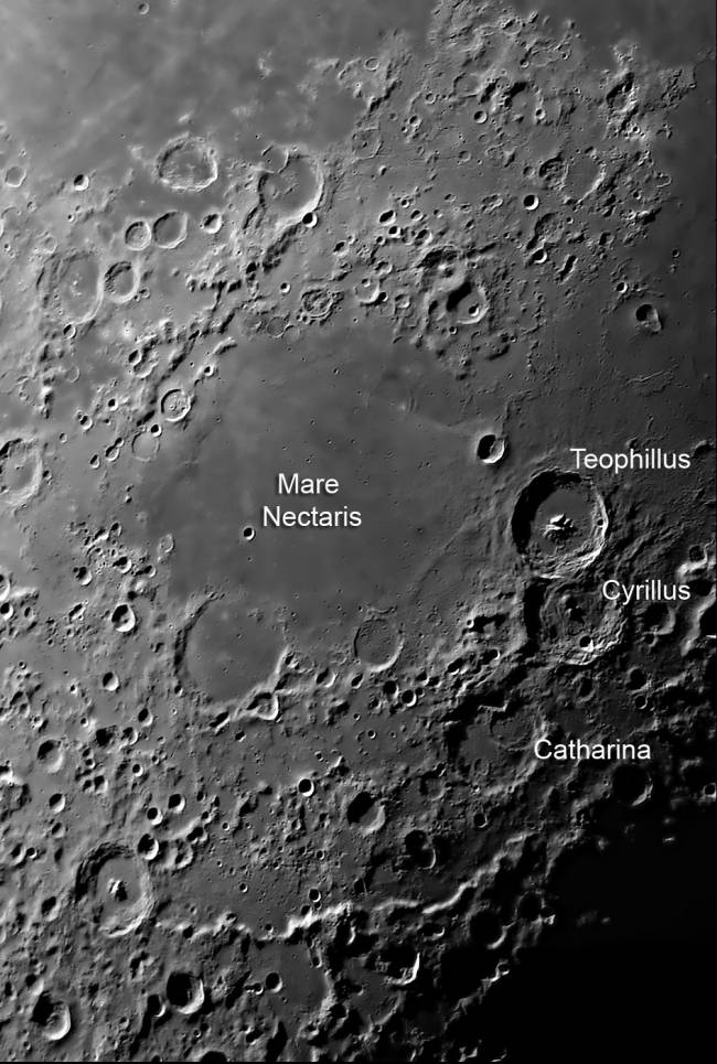 Cinco días después de la Luna nueva, nuestro satélite nos ofrecerá el viernes, en la zona del terminador (la frontera entre el día y la noche lunar), una de las visiones más espectaculares que podamos encontrar en toda su superficie: el trío de cráteres formado por Teophilus, Cyrillus y Catharina, junto al Mare Nectaris, una cuenca de 350 km de diámetro y 3.920 millones de años de antigüedad. Se trata de tres cráteres de similar tamaño, alrededor de 100 km de diámetro cada uno de ellos, pero con grandes diferencias en su aspecto, con paredes de hasta 3.000 m de altura, picos centrales que se elevan más de 1.000 m y pequeños cratercillos esparcidos en el fondo.