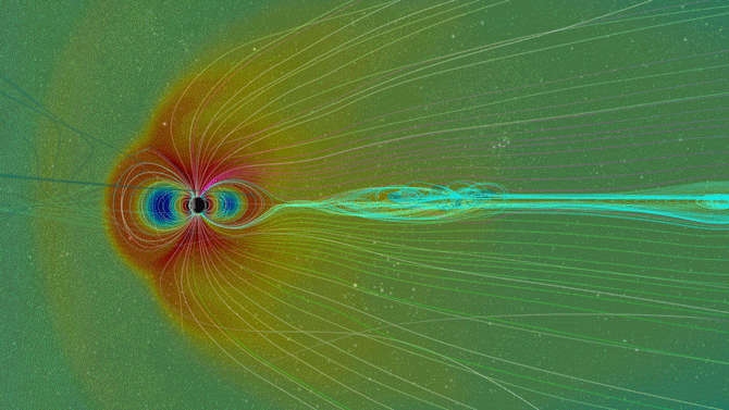 Simulación de una erupción solar golpeando el campo magnético de la Tierra. / NASA's Goddard Space Flight Center/Scientific Visualization Studio/Community-Coordinated Modeling Center