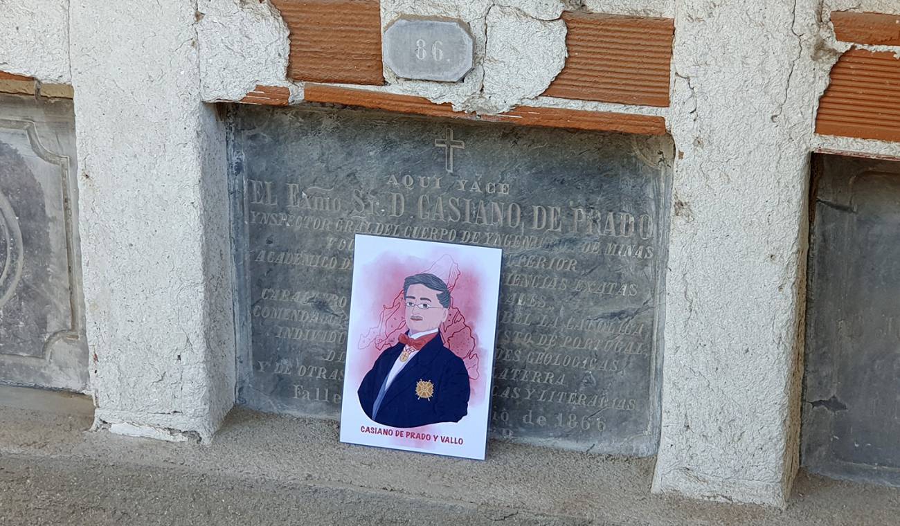 Nicho de Casiano de Prado en el cementerio de San Isidro, con una ilustración colocada durante la visita. / SINC
