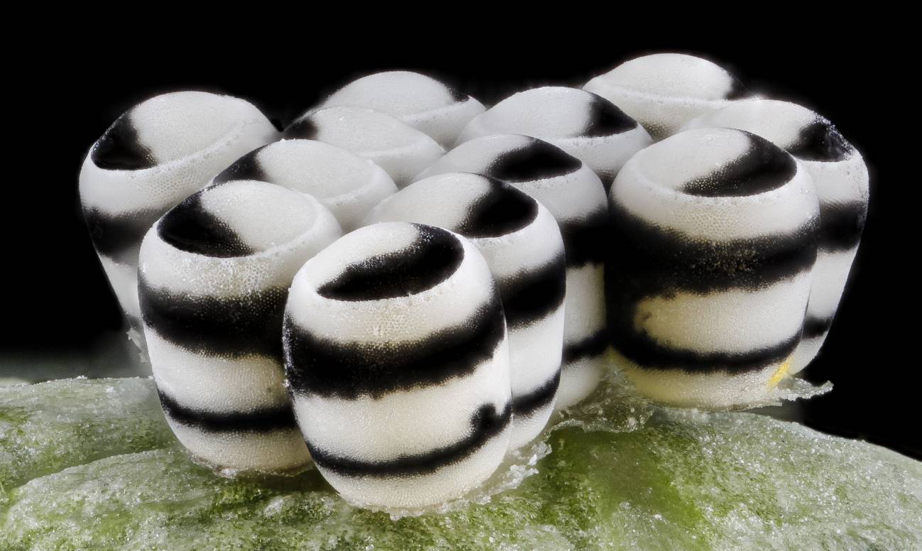 Los huevos de la chinche arlequín ('Murganta histriónica'),, son irregulares y blancos y negros. Se realizan entre cinco y siete puestas de varias decenas de huevos que tardan 15 días en eclosionar.