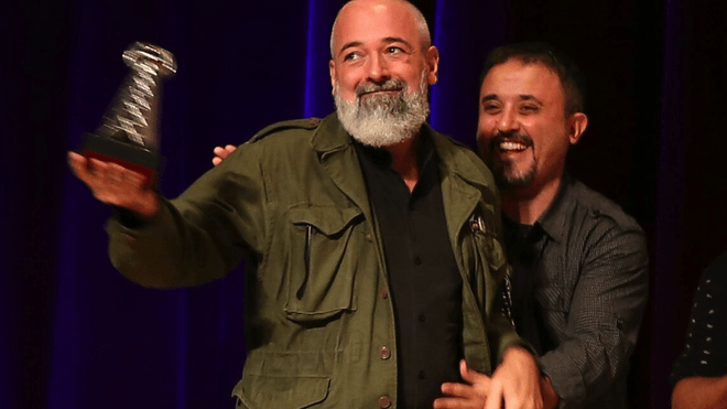 José Cervera con su amigo Antonio Martínez Ron, recogiendo el premio Tesla durante el evento Naukas Bilbao en septiembre de 2017. / Rafael Martínez Ramón