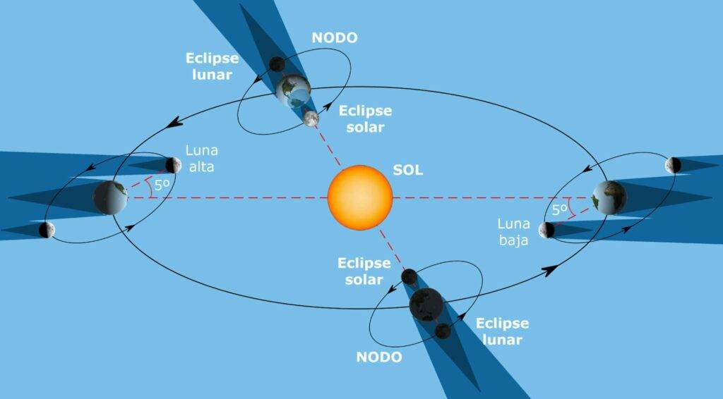 La Luna gira en órbita alrededor de la Tierra en aproximadamente un mes. Sin embargo, no tenemos un eclipse cada mes. ¿Por qué? Lo que ocurre es que el plano que contiene la órbita de la Luna alrededor de la Tierra y el plano que contiene la órbita de la Tierra alrededor del Sol no coinciden. Hay una pequeña diferencia de 5,14. Esto hace que la mayor parte de las veces el Sol, la Tierra y la Luna no estén alineados y la sombra de la Luna no se proyecte sobre la superficie terrestre. En esta situación no hay eclipse.