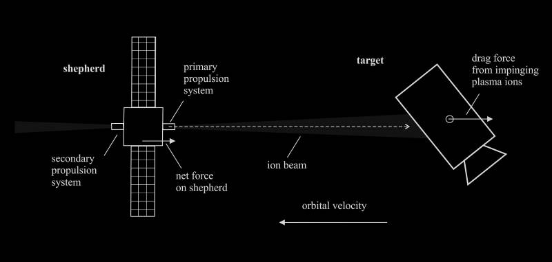 HAZ DE IONES. Ingenieros aeronauticos de la Universidad Politécnica de Madrid han diseñado un sistema para, desde un satélite, proyectar un plasma de iones acelerados contra un asteroide o una nave (como en la imagen) para variar su trayectoria. / Hiperpiper