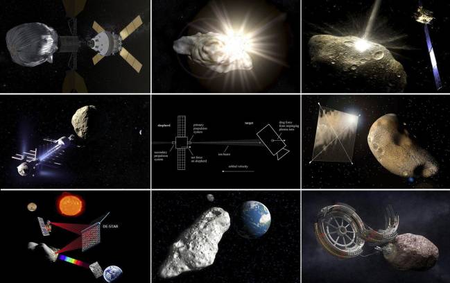 El 15 de febrero de 2013 un asteroide sorprendió al mundo cuando cruzó los cielos y explotó sobre la ciudad rusa de Chelyabinsk. Los daños materiales fueron cuantiosos y más de mil personas acudieron al hospital con lesiones leves. Aun así, la caída de este objeto nada tiene que ver con la del gigantesco asteroide que se supone acabó con la vida de los dinosaurios hace millones de años. Son sucesos que pueden volver a ocurrir en cualquier momento y no es nada fácil predecirlos ni evitar sus consecuencias. Los científicos se afanan por encontrar la mejor estrategia para destruir o desviar a estos objetos que pueden poner en peligro a nuestro planeta. Aquí se presentan nueve propuestas ¿Cuál puede ser la mejor?